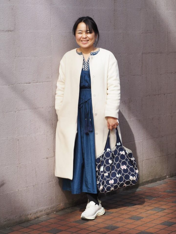 長らくタイに住んでいたこともあり、アジアンテイストのアイテムが好きだという坂田さん。この日は「ヌキテパ」のワンピースに純白のコートをはおり、爽やかなツートンコーディネートに。「しなやかで軽い肌触りはインド綿ならでは。身につけているだけでほっとします」