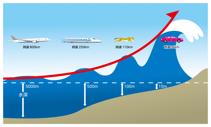 また、周期の長い波の特徴として「浅海効果」と呼ばれるものがあります。これは津波の速度は水深が深い場所ほど速く、水深が浅い場所ほど遅くなりますが、津波の高さは水深が深いほど低く、水深が浅いほど高くなるというものです。津波の高さが海岸に近づくと急に高くなり、沿岸部を襲うのはこのためです。