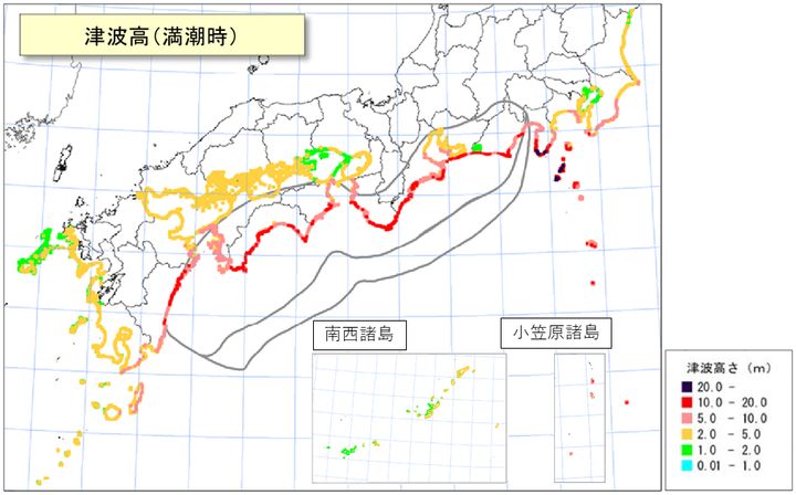 九州から四国、近畿、東海にかけて広い範囲で10mを超える津波が予想されています。
