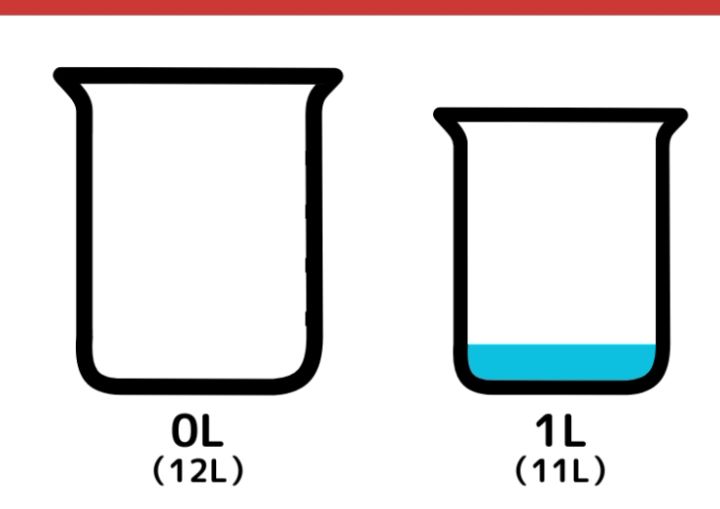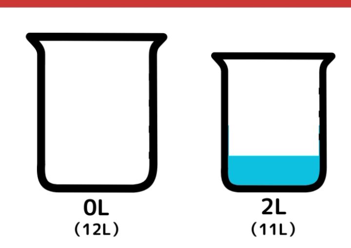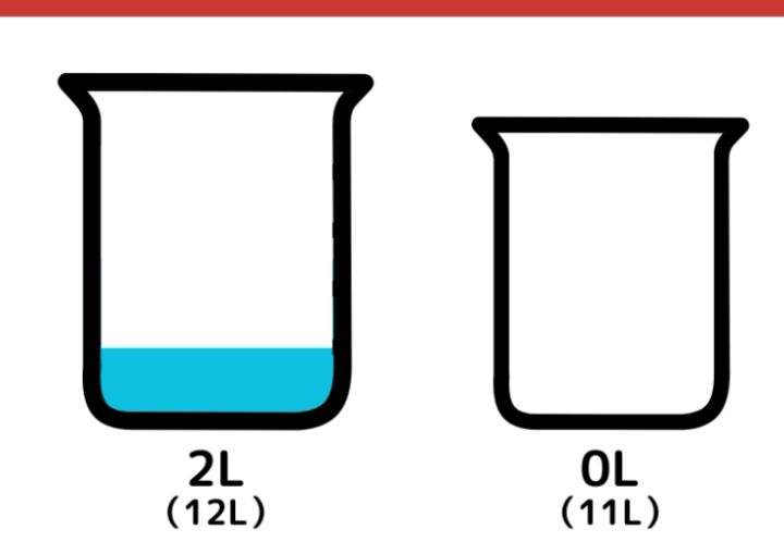 再度12L容器から11L容器に水を移します。11L容器にはすでに1Lの水が入っていたので、10Lの水が移り、12L容器には2Lの水が残ります。