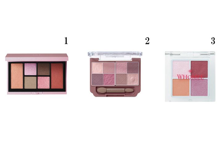 1.RMK ザ ピンク ハイ アイズ & ブラッシュ パレット ¥8,250(数量限定)、2.キャンメイク プティパレットアイズ(マットタイプ) M02 ¥1,078/井田ラボラトリーズ、3.フーミー リリュタンパレット ビスチェ ¥1,320/Nuzzle