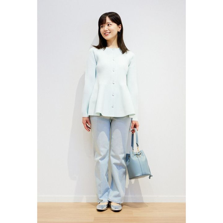 ホールガーメント®ペプラムカーディガン[63 BLUE]¥11,000 PLUS STYLEハイライズワイドジーンズ[62 BLUE]¥13,000スクエアトゥメリージェーン2WAYパンプス[80 SILVER]¥9,990(すべてプラステ)