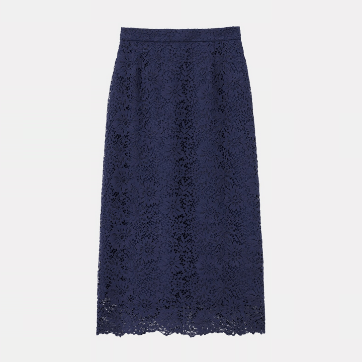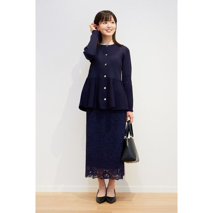 濃紺のペプラムニットとレーススカートを掛け合わせれば、一気にオケージョン感がアップ。全体的に落ち着いた雰囲気だからこそ、ニットのメタルボタンや繊細なレースが際立ち、ほどよく華やいだ装いに仕上がります。