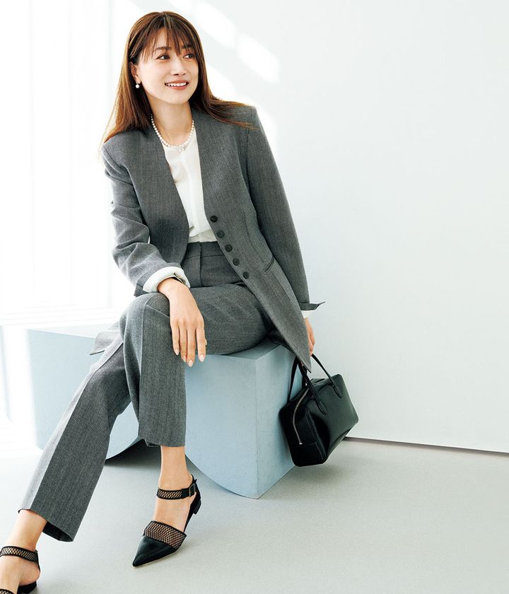 ネックレス「ボウ チャーム」〈アコヤパール×DIA×WG〉¥1,540,000ピアス〈アコヤパール×DIA×WG〉¥235,400(ともにMIKIMOTO/ミキモト カスタマーズ・サービスセンター)ジャケット¥62,700パンツ¥46,200(ともにETRE/ETRE TOKYO)ブラウス¥49,500(デパリエ/デパリエ 伊勢丹新宿店)靴¥184,800(マノロ ブラニク/ドゥロワー 二子玉川店)バッグ/スタイリスト私物
