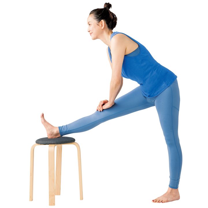 ①椅子を足の長さ分前方に離して置き、右足をのせる。背中が丸くならないよう、膝をしっかり伸ばし、足首を反らす。