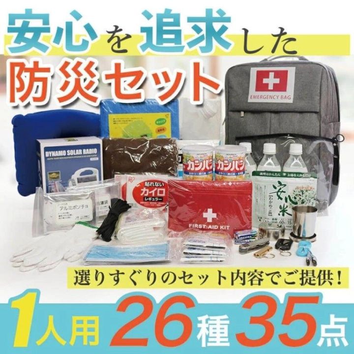 ラジオ・ライト・スマホの充電までできる多機能型ライトをはじめとした、そろえておくべきアイテムが35点も入っています。