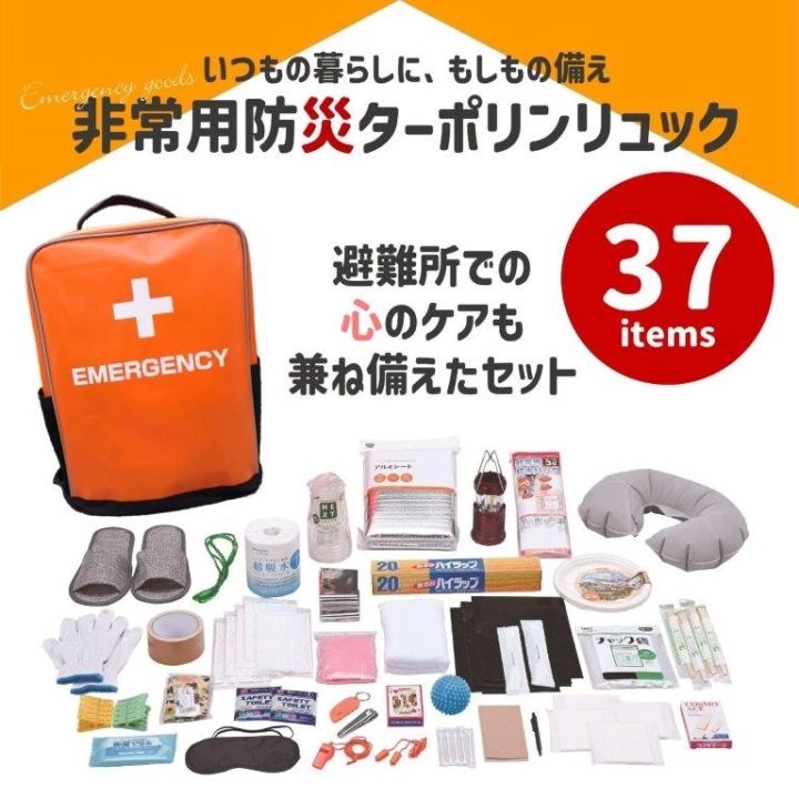 セット内容:絆創膏、ネイルケア4点セット、マスク(5枚)、綿棒(5本)、歯ブラシ(2本)、簡易トイレ(2個)、トイレットペーパー、ウェットティッシュ、生理用品、レジャーシート、アルミシート、アイマスク、耳栓、ネックピロー、ラップ、割り箸(4本)、3Lタンク、紙皿(10枚)、コップ(5個)、レインコート、ロープ(2m)、軍手、便利11点ナイフ、ストレス・マッサージボール、トランプ、笛、スリッパ、メモ帳、ボールペン、ゴミ袋、2WAYスライドランタン、ガムテープ、洗濯バサミ(10個)、コンパクトバッグ、フリーザーバッグ、タオル、ターポリンリュック