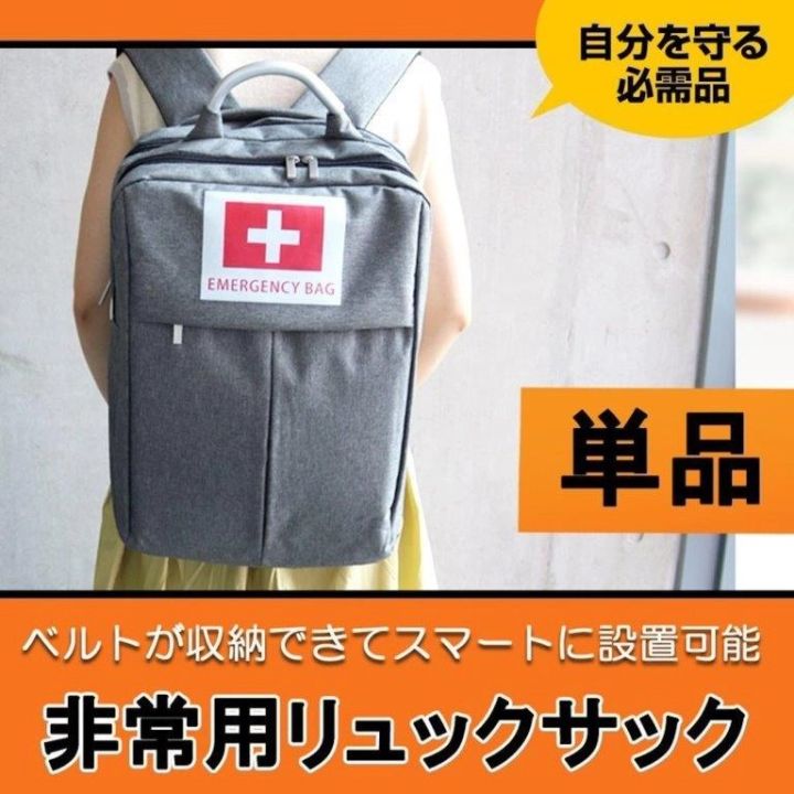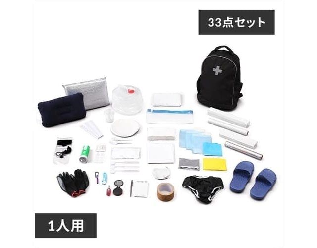 セット内容:リュックサック、緊急用ホイッスル、2WAYドライバー、カッター、圧縮袋、予備袋、筆記用具セット、歯ブラシ×3本、綿棒×20本、マスク×3枚、携帯トイレ×3個、45Lポリ袋×3枚、紙皿×3枚、プラカップ×5個、割り箸×5膳、スプーン・フォークセット、2WAY懐中電灯、ラバー手袋、お薬ケース、布テープ、レインポンチョ、サンダル、アルミシート、アルミブランケット、エア枕、非常用給水バッグ、ラップ、アルミホイル、ボディタオル、ティッシュ