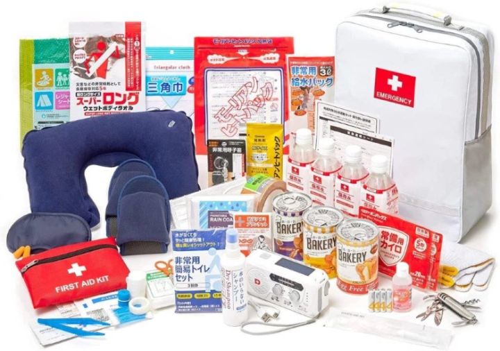 セット内容:ラジオつき手回し懐中電灯、エアー枕、アイマスク、耳栓、非常用トイレ(3個)、レジャーシート(180cm×180cm)、レインコート、救急セット、エアーマット、ブランケット(約120×85cm)、保存水(3本)、カンパン&クラッカー(各1個)、アルファ米、非常用給水袋、フードつきアルミポンチョ(約127×101cm)、簡易アルミ寝袋(約100×200cm)、マルチツール、非常用ホイッスル、LEDミニライト、スリッパ、3in1USB充電ケーブル、5年保存水(3本)、ロープ、ビニールケース、軍手、カイロ(2個)、マスク(3個)、乾電池(4個)