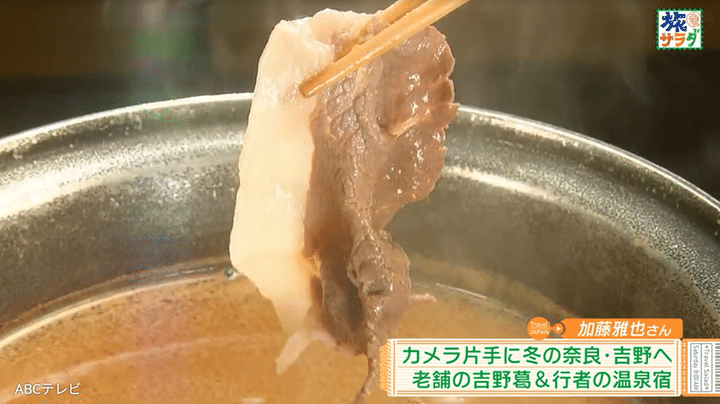 350年以上の歴史を持つ角甚では、地元の食材を使ったコース料理が提供される。初めて味わった天川びわこんにゃくに、「食べたことがない味やなぁ」「新食感みたいな」と、加藤はビックリ。ほかにも、洞川の川魚、大峯の鹿や猪の肉、大和野菜、鍋の〆の天川葛うどんも味わうことができて、加藤は大満足した様子だった。