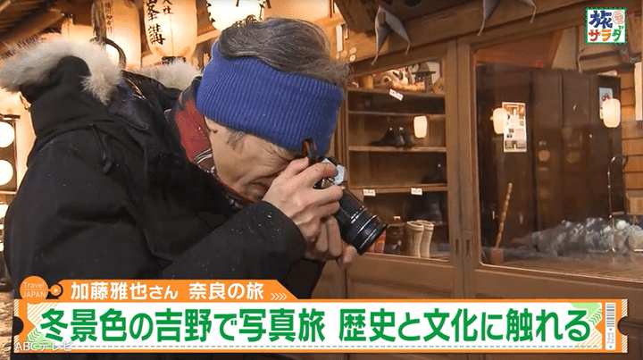 朝だ!生です旅サラダ』(ABCテレビ)に初出演したのは、俳優の加藤雅也だ。奈良市観光特別大使を務める加藤は、同番組の3月1日放送回で、冬の奈良を旅したVTRを公開した。写真が趣味の加藤は、カメラを片手にまずは吉野町へ。世界遺産・吉野山のシンボルである金峯山寺の参道をブラリと散策し、温かい葛もちを味わい、1350年の伝統を持つ吉野和紙の紙漉きを体験しながら、各地の魅力をカメラに収めた。