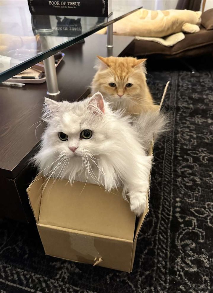 ダンボール箱に入っているのは、ミヌエットの『ノーマン』くん(前)とラガマフィンの『エマ』ちゃん(後ろ)。 同じダンボールに収まるその姿は、電車ごっこをする子供の姿を連想させます。