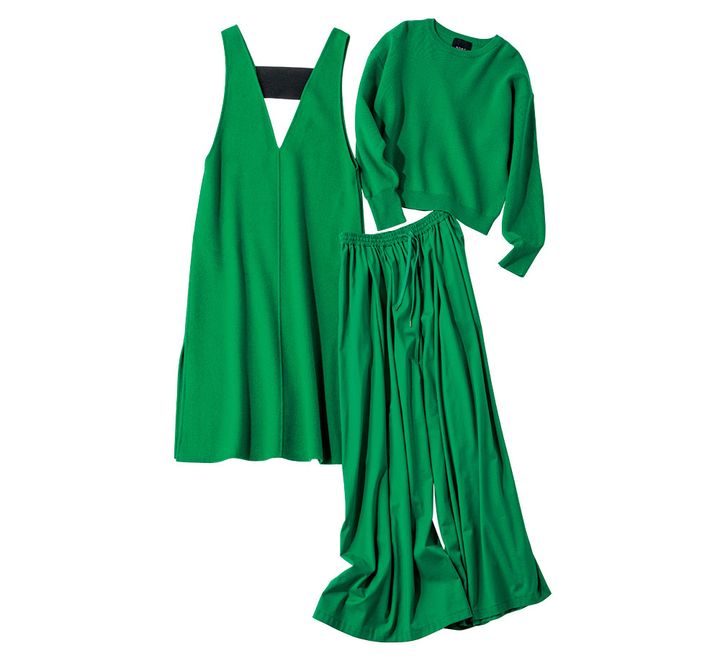 芯の強さを示す濃いグリーンは甘辛の微調整役にも。〈右上〉ニット¥8,800(ノーク)〈左上〉ジャンパースカート¥57,200(LE PHIL/LE PHIL NEWoMan 新宿店)