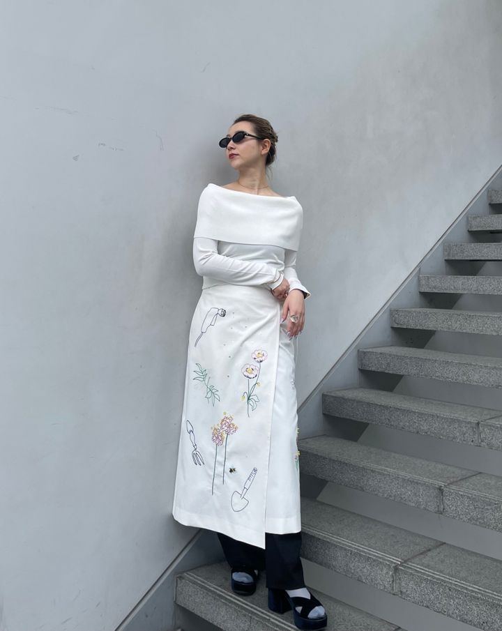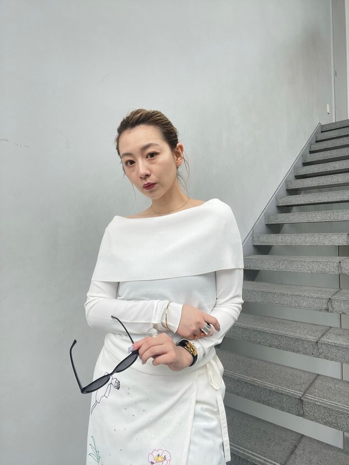 「オフショルダープルオーバーニットは今季のニューカラーのホワイトを購入しました! 実は去年、色違いでブラックを購入していたのですが、お気に入りでリピート買い。デミルクス ビームスのオリジナルで、ボトムはなんでも合わせやすいのですが、メンズライクなハーフパンツやテーラードパンツに合わせてかっこよく着ても素敵です。今回は春めいたオールホワイトなスタイリングに。フェミニンなミュベールのガーデニングスカートにオフショルダーで女性らしいバランスを意識しました」