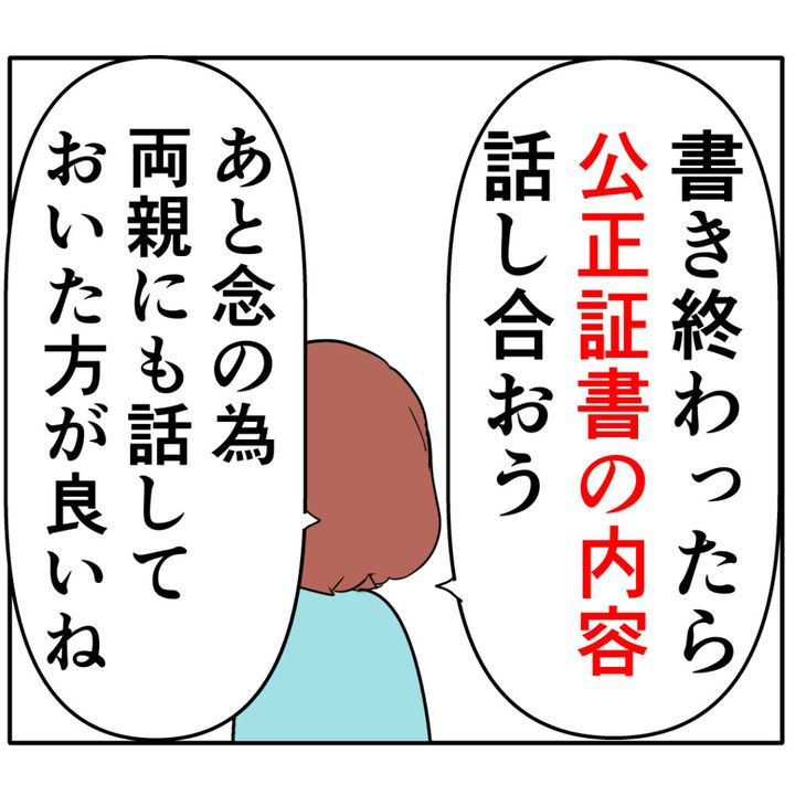 めいさんは「書き終わったら公正証書の内容話し合おう。あと念の為両親にも話しておいた方が良いね」と淡々と話しを進めます。