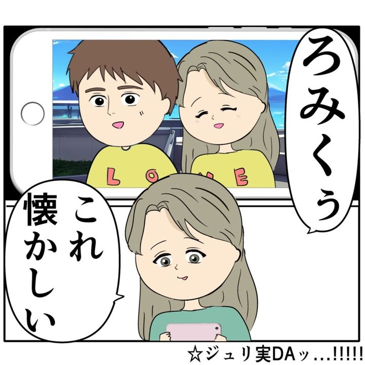 ろみ緒さんがなんとか今すぐの離婚を回避したその頃。離婚の最大の原因となっている元彼女ジュリ実さんは、スマホに残るろみ緒さんとの昔の写真を見ながら「ろみくぅ。これ懐かしい」と付き合っていた頃のことを懐かしく思い出していました。