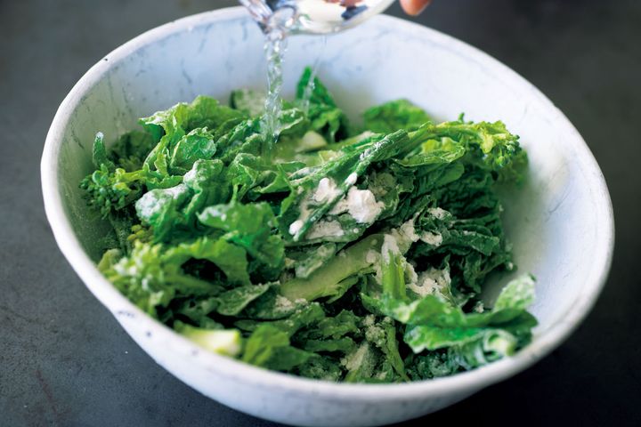 (1)菜の花は縦半分に切って(長いものは長さを半分に切る)ボールに入れる。小麦粉大さじ4を加えてまぶし、水大さじ4を加えて全体にからめるように混ぜる。