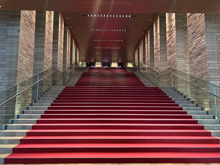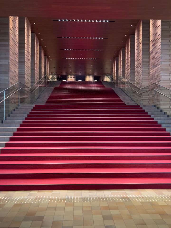 フェスティバルホールのあるこちらの建物を入ってすぐ、目に入る赤く上品な大階段。