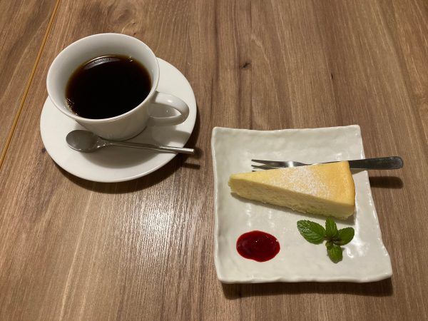最後のデザートは濃厚なチーズケーキを選択。2種類から選ぶことができます。 フランボワーズの酸味の効いたソースとペパーミントでしっとりしたベイクドチーズも苦味の効いた珈琲と一緒においしくいただけました。