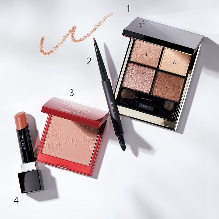 1:ベージュからブラウンのグラデーションにピンクのパールカラーが入ったウォームトーンのパレット。SUQQU シグニチャー カラー アイズ 14 ¥7,700 ※1/24発売(SUQQU)2:しっとりフィックスして引き締めすぎず、奥行きのある目元に仕上げるグレー混じりのブラウン。オサジ ニュアンス レゾナンス アイライナー EX02 ¥3,190 ※数量限定(OSAJI)