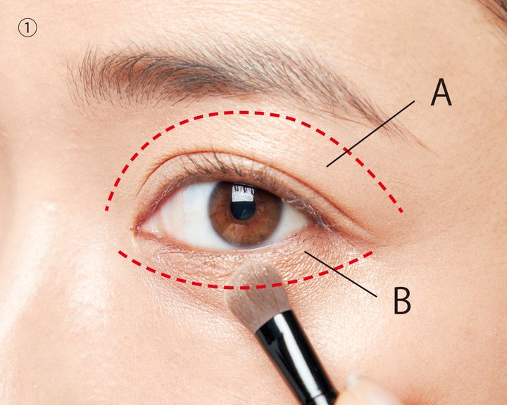 Aをブラシに取り、アイホール全体に、Bを下まぶたに入れて幅と奥行きを出す。