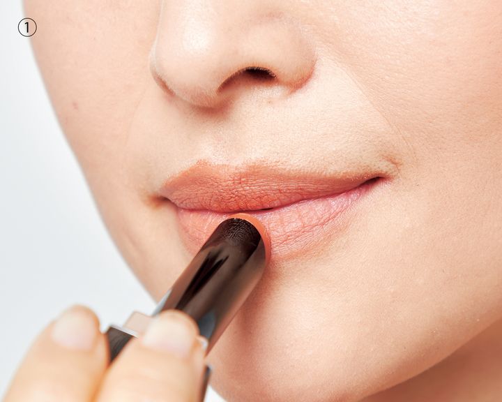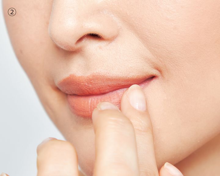 唇の中央から左右に伸ばすように直塗りで色をのせて、まずは色をしっかりと発色させる。