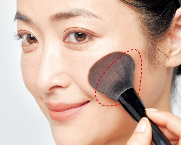 チークを大きめの筆に取り、チークボーン下のくぼみに沿わせ、こめかみまで斜めに入れる。