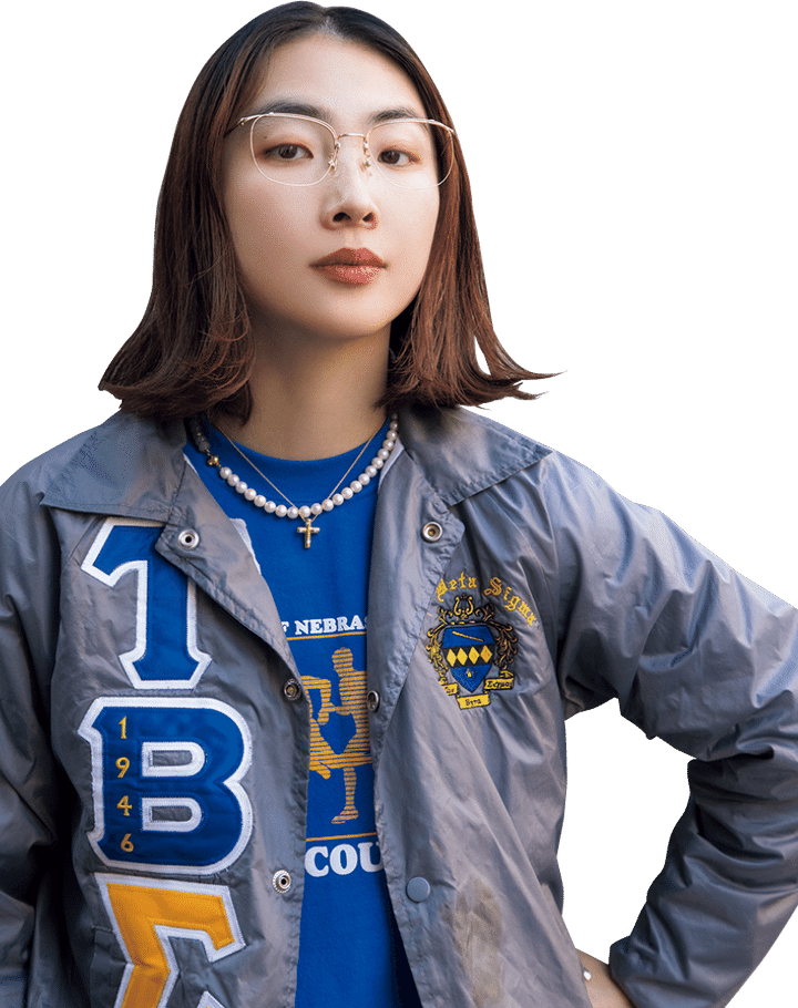 RENOMA RUFUS. Parisの眼鏡、ヴィンテージのブルゾンとスエット、MIHOKO&SAKAIのネックレスは本人私物