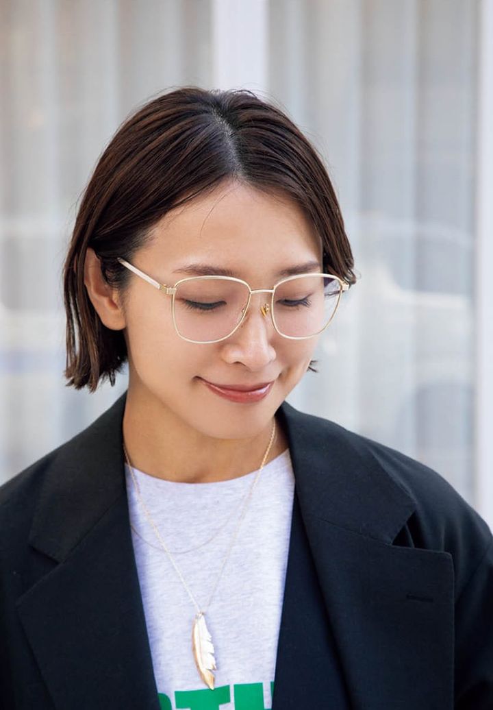 「中学時代から眼鏡をかけ続けている私が眼鏡選びで一番大切にしているのが“軽さ”。ヴィンテージのレノマはフレームが細く、どんなスタイルにもハマるお気に入りの1本です」(長峰由莉さん)