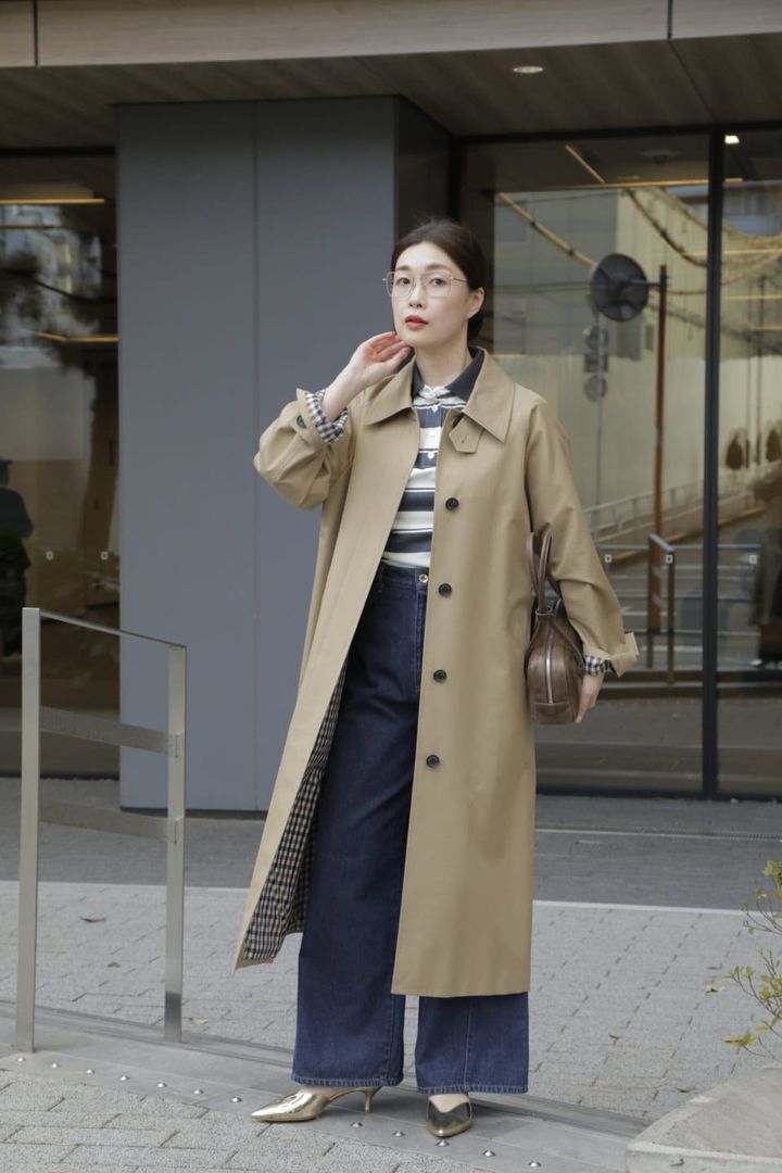 「メタリックなこの眼鏡をかけるときは、少しGEEKなムードでまとめるのが好きです。ポロシャツにトレンチコートを合わせ、足元は女性らしいヌケ感が出るようにゴールドのパンプスを選びました」(市川綾子さん)