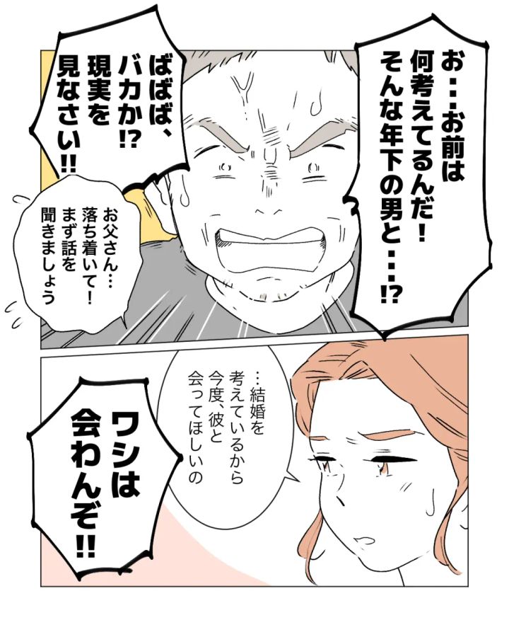「お・・お前は何考えてるんだ!そんな年下の男と・・!?ばばば、バカか!?現実を見なさい!!」ジュンの年齢を聞いて動揺した父は怒りだし、母が必死になだめました。重い空気の中「・・結婚を考えているから今度、彼と会ってほしいの」と言うと「ワシは会わんぞ!!」と父は即答。