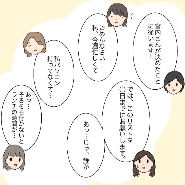 「宮内さんが決めたことに従います!」「私忙しくて」「私パソコン持っていなくてリスト作れません」など人任せでやる気のない発言ばかりで誰も動こうとしません。