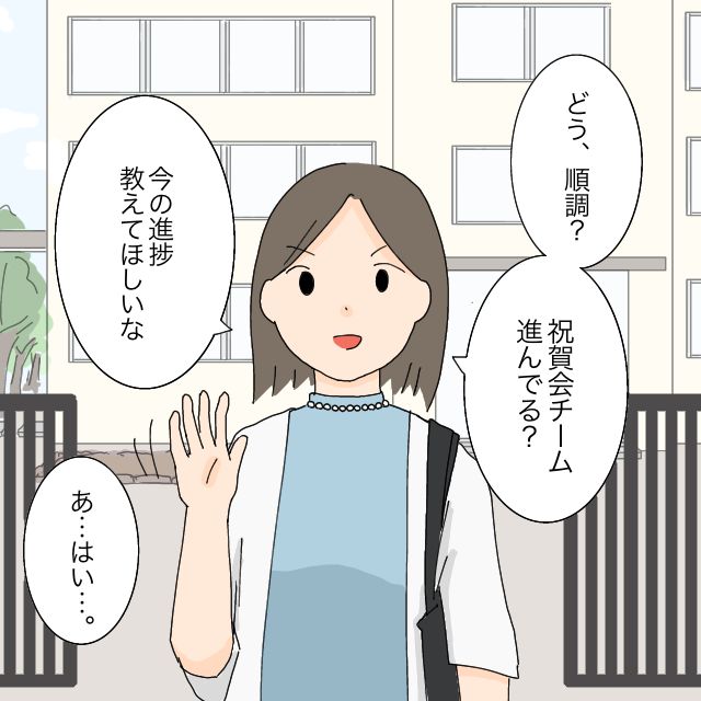 別の日、「ゆうくんのママ!どう、順調?祝賀会のチーム進んでる?今の進捗教えてほしいな」とだいくんママから話しかけられました。