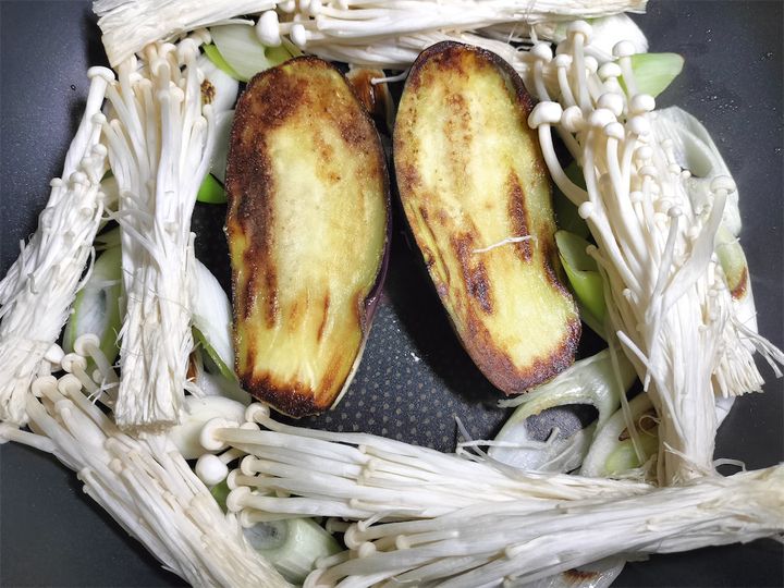 5. なすを裏返し、長ねぎをほぐしたところにえのきを加えて炒め、しんなりしてきたら長ねぎとえのきを取り出します。なすもいい感じに火が入ったら取り出しておきます。
