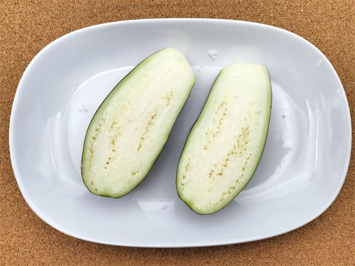 なすは縦半分に切っておきます。