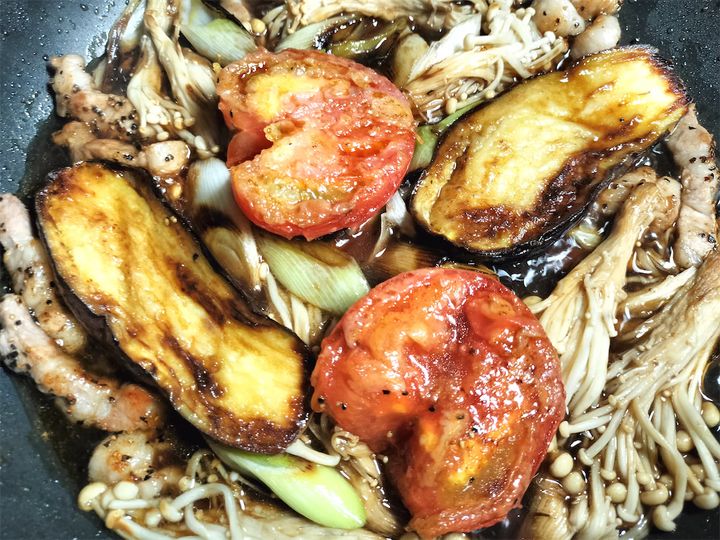 11. 野菜(なす、長ねぎ、えのき、トマト)と1で作ったソースを入れます。