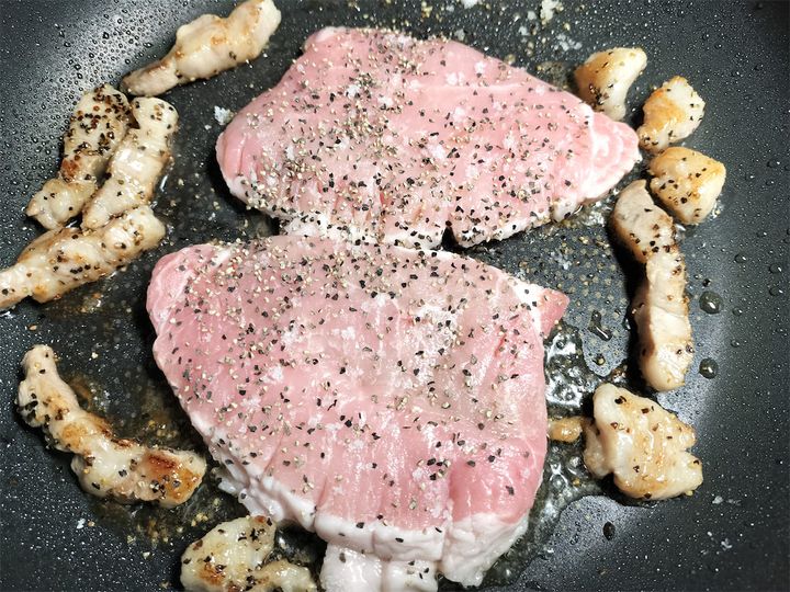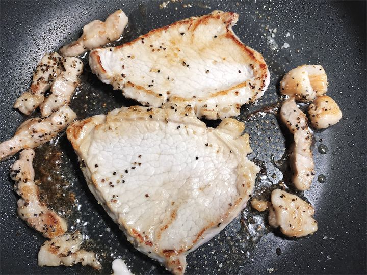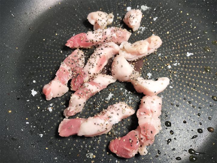 8. フライパンをキッチンペーパーで軽く拭き、中火のまま豚肉の脂を入れて塩、黒こしょう適量を振ります。
