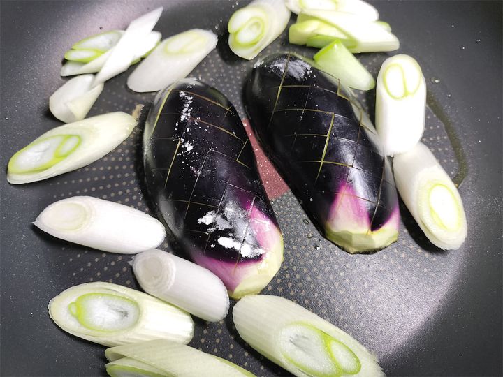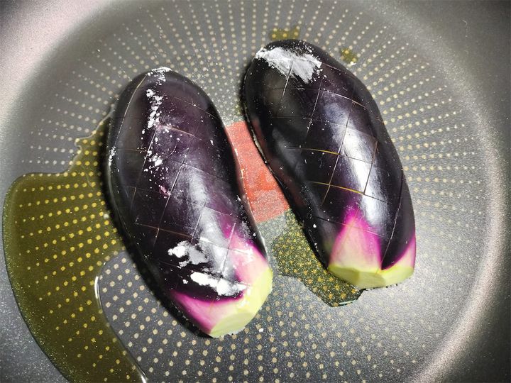 3. フライパンにオリーブオイルを入れて中火にかけ、切り口を下にしてなすを入れます。