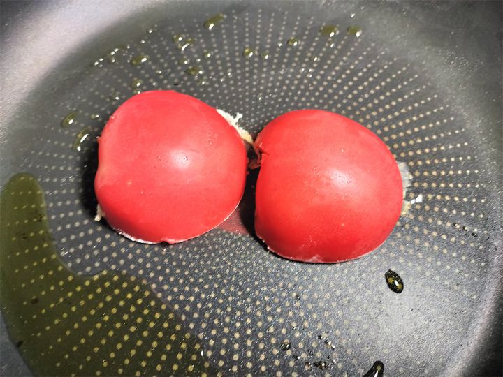 6. フライパンにオリーブオイルを足して、切り口に小麦粉をつけたトマトを焼きます。