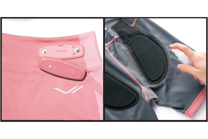 ヒップ部分の布製電極をスプレーで濡らし、着用してコントローラーをセット。スイッチを入れてレベル調整するだけ!
