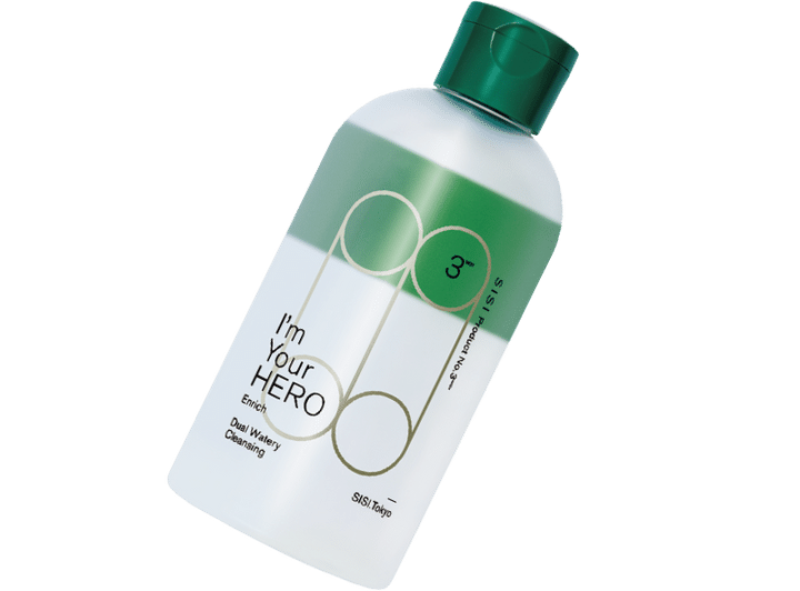 オイル層と美容液層をシェイクしてコットンに浸し、優しく拭き取るだけでメイクをオフ。アイムユアヒーロー エンリッチ 230mL ¥3,980(SISI)