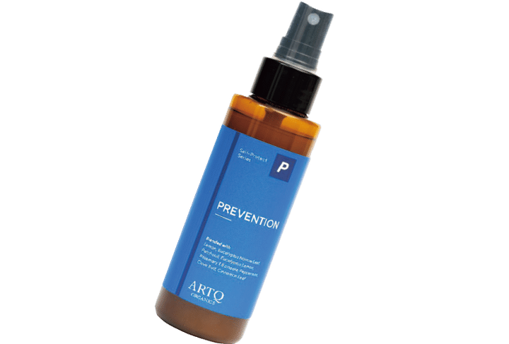 オーガニック認証精油を使用したブレンドスプレー。「オーガニックのクローブやシナモンの精油の香りで空気も気持ちもすっきりリフレッシュ。現場での感染予防対策にも活用」同 プリベンション 精油ブレンドスプレー 100mL ¥2,420(Blue ink)