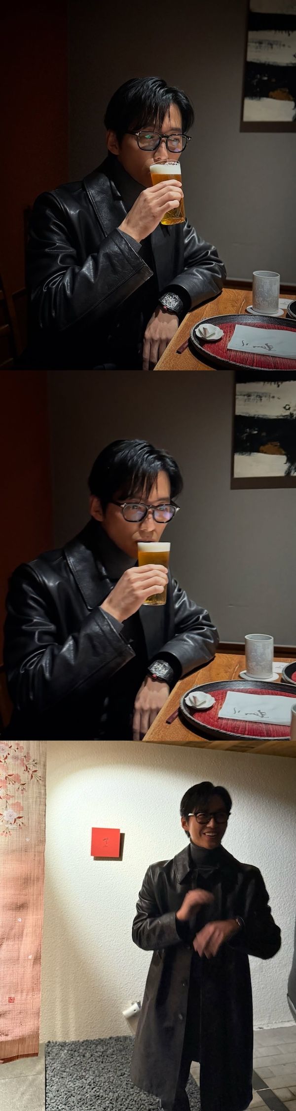 ナムグン・ミンは生ビールを飲みながら、疲れを癒している様子。黒縁メガネをかけ、ギークシックルックを完成させた彼の姿が、まるで男性ファッション誌のワンカットのようだ。