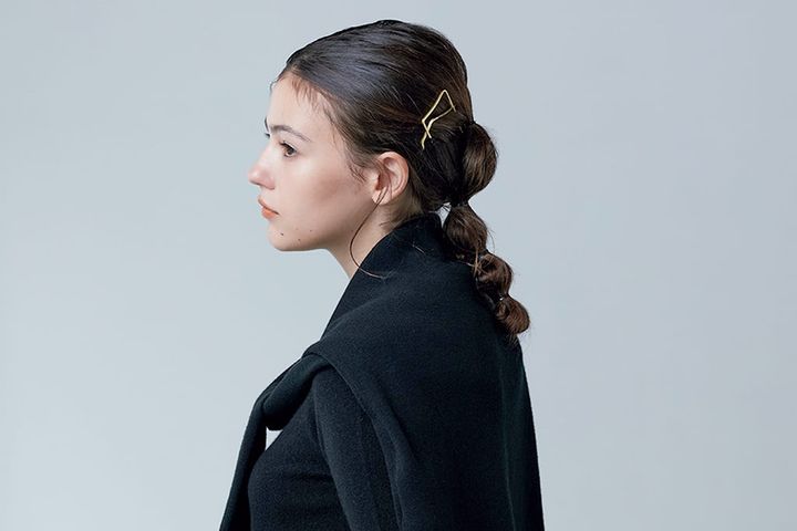 エッジと穏やかさが同居したようなまとめ髪。個性的なヘアとメタルコームを融合させた、モードなアレンジは、重心高めのハーフアップをつくり、残った毛をまとめて等間隔に結んでいくだけ。髪を引き出して丸みをもたせ、毛先を中に入れ込んだらちゃめっけもかなう。