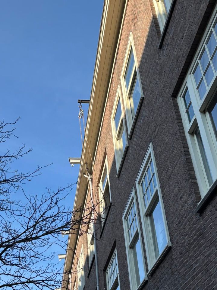 オランダの運河沿いの多くの住宅は階段がないため、引越しの際や大きな荷物を家に入れる際は天井についているフックに滑車を繋げて搬入するんです。