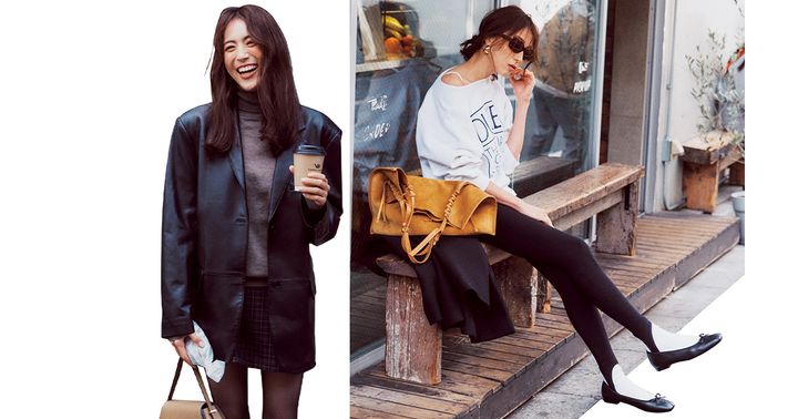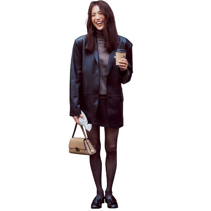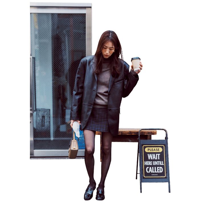 シアータイツありき、で冬こそミニ派!ここで大事なのが足元。女度の高すぎるパンプスはトゥーマッチだから、あえてトラッドなローファーで。羽織りはオジみのあるレザージャケットくらいがちょうどいい!