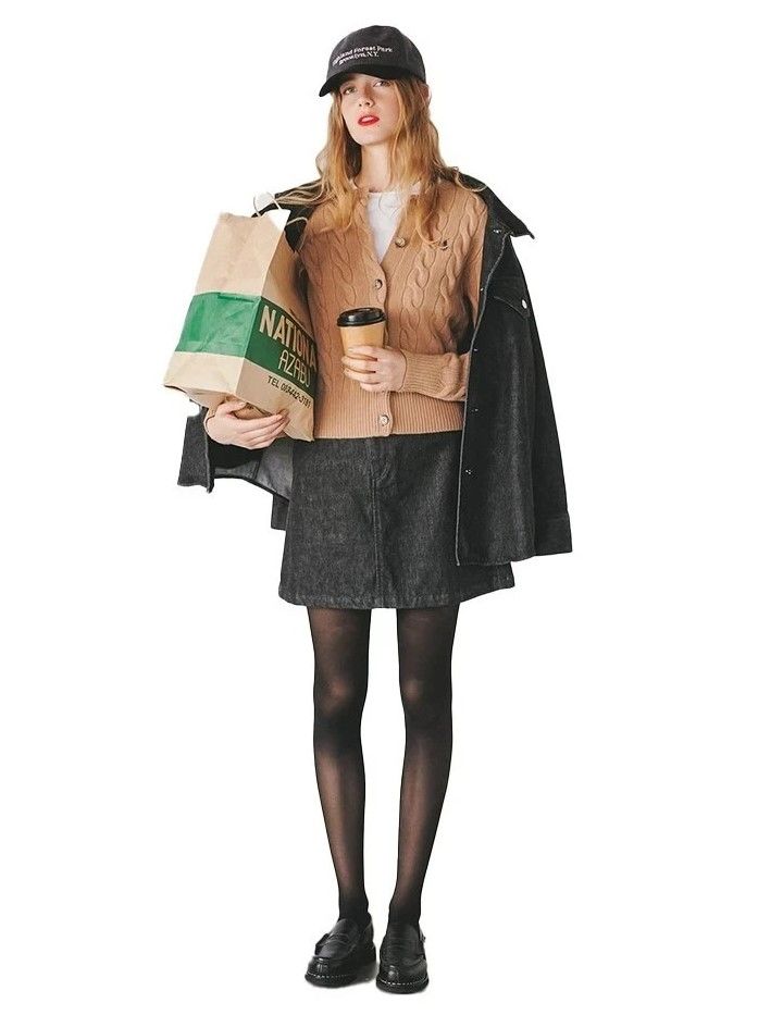 ミニスカートとタイツ、ローファーなど全体をかわいく見せるスタイリングはそのまま着ると少し気恥ずかしさも。ナチュラルにふるまいたいときこそ、キャップ合わせで日常に。ダークカラーを選べば、スタイリングにもなじみやすく。