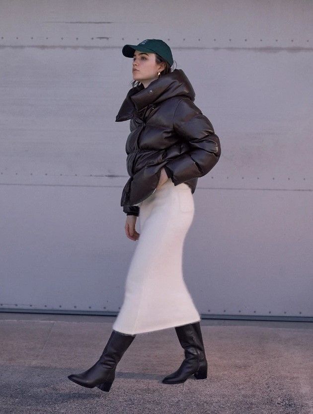 ダウンや旬のパファージャケットをハズしと捉えて、Iラインスカート+足元はキレイめなブーツなどダウン以外はコンサバに。キャップが「キレイすぎない」仕上がりのバランス調整役。