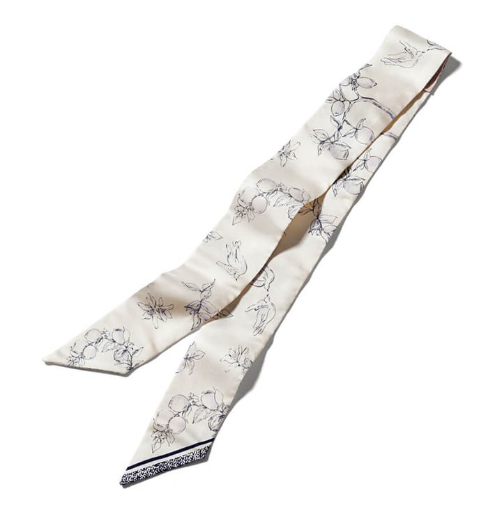 さっと結べて扱いやすいボウタイ状のスカーフ。バッグや胸元にアクセサリー感覚でプラスするのもおすすめ! ここでは、トップスのボタン穴を使ったリボン結びをレクチャー♪