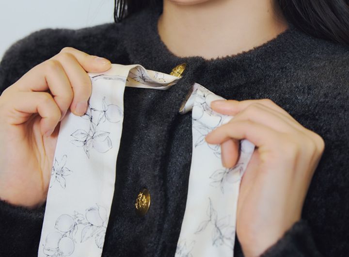 スカーフの端をトップスのボタン穴に 通し、リボン結びするだけの簡単アレンジ。手持ち服を格上げしてくれます。